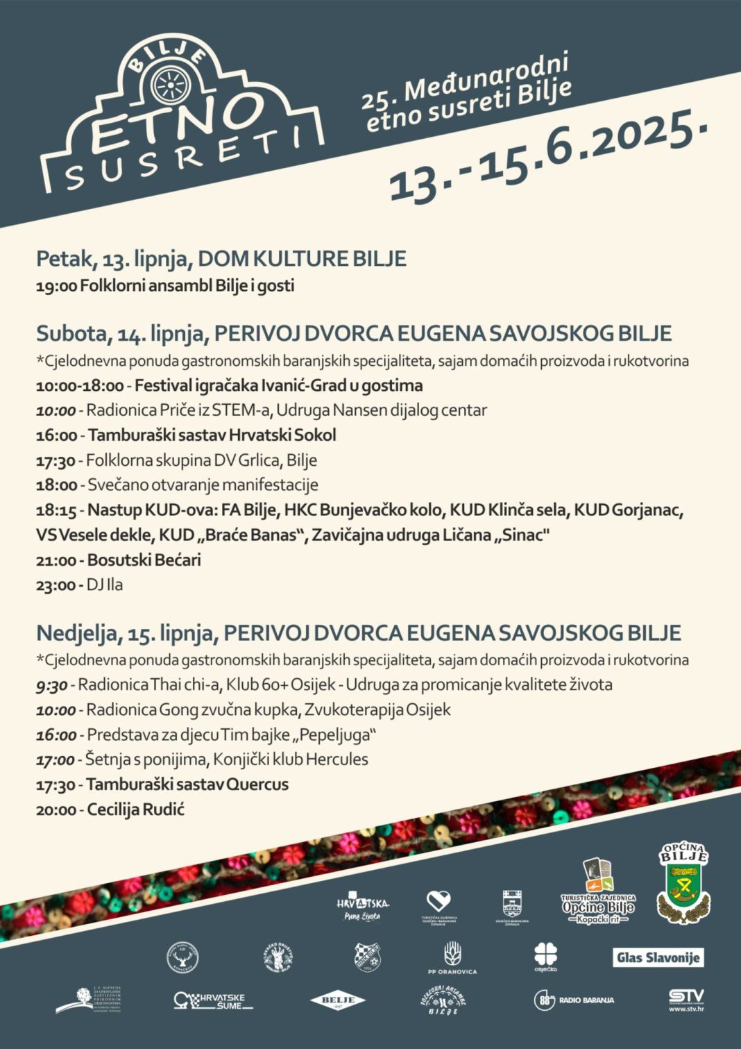 BILJE, 14. lipnja 2025. – U srcu Baranje, pod krošnjama stoljetnog parka dvorca Eugena Savojskog, ovog vikenda odvija se jedno od najznačajnijih kulturnih događanja na istoku Hrvatske – jubilarni 25. Međunarodni etno susreti u Bilju. Od 13. do 15. lipnja, Bilje se pretvara u živo središte tradicije, glazbe, plesa i međukulturne razmjene, privlačeći brojne posjetitelje iz Hrvatske i inozemstva.