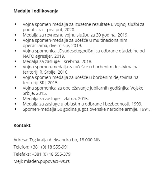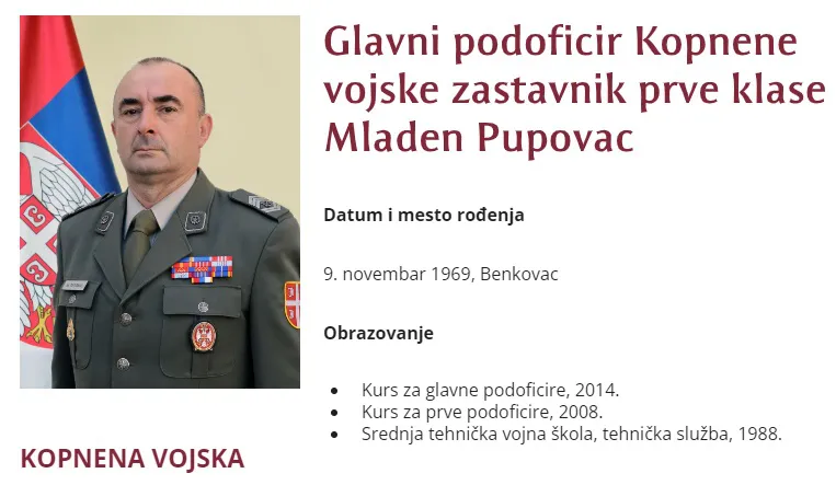 Podaci prikupljeni s Glavni podoficir Kopnene vojske zastavnik prve klase Mladen Pupovac | Vojska Srbije (vs.rs)