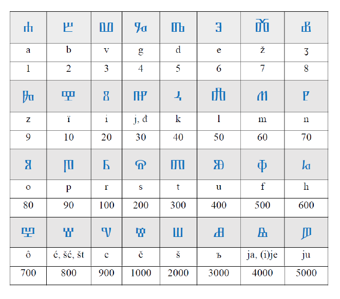 Glagoljska slova ne označavaju samo glasove nego imaju i brojevnu vrijednost. Kad je glagoljsko slovo označavalo broj, iznad njega dolazila je titla (~), a oko njega točkice.