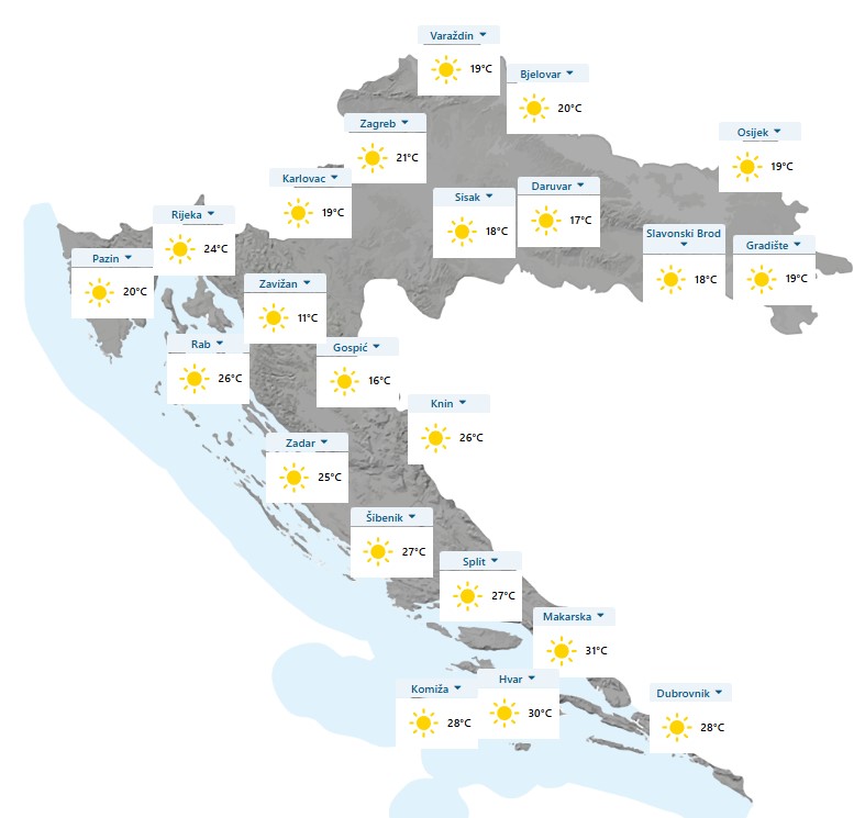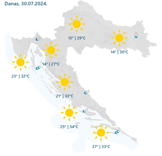 Najviše temperature zraka bit će između 27 i 31 °C, dok će na Jadranu i u unutrašnjosti Dalmacije dosezati između 31 i 35 °C. Stoga se preporučuje oprez i pridržavanje mjera zaštite od vrućine.