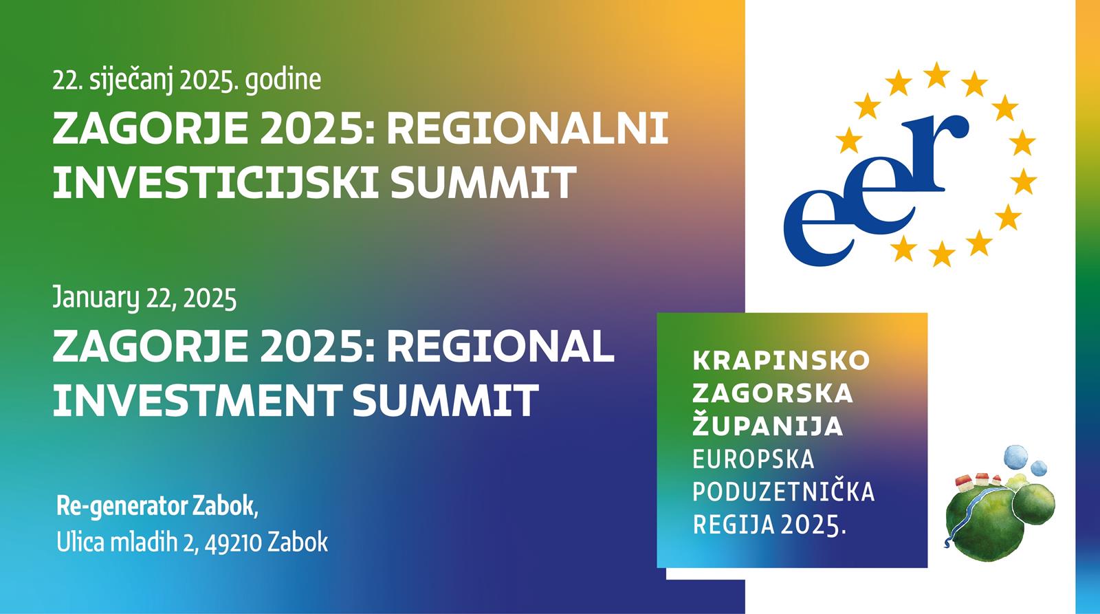 Zabok, 20. siječanj 2025. – Krapinsko-zagorska županija, kao ponosni nositelj titule Europske poduzetničke regije 2025., organizira Regionalni investicijski summit Zagorje 2025! Ovaj prestižni događaj, koji će se održati 22. siječnja u modernom prostoru Re-generatora u Zaboku, okuplja vodeće stručnjake, donositelje odluka i predstavnike akademske zajednice iz Hrvatske i šire.