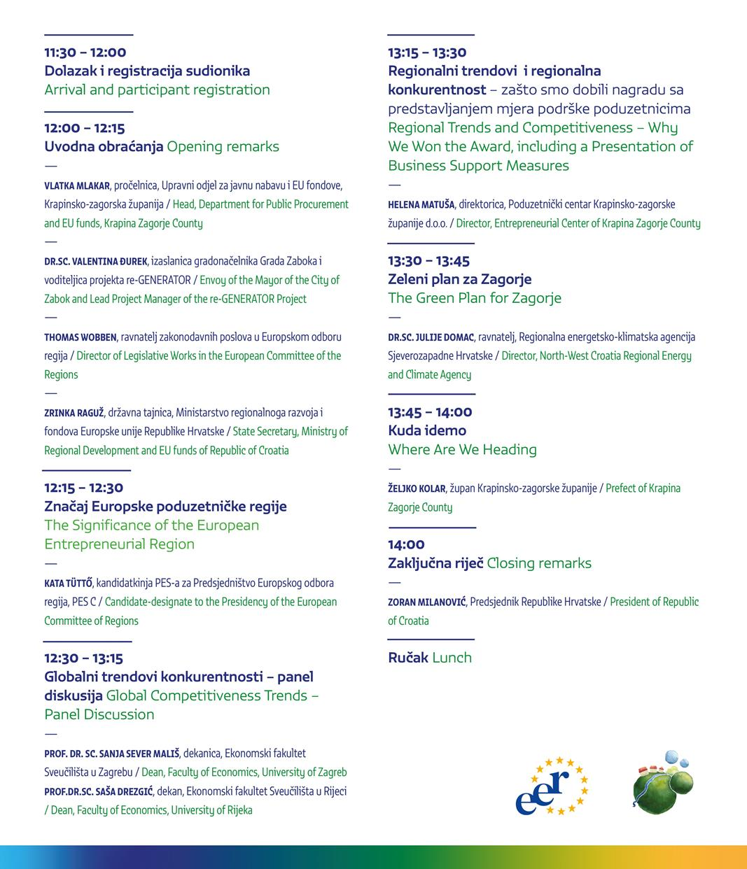 Događaj će otvoriti izaslanica ministra regionalnog razvoja i fondova EU, državna tajnica Zrinka Raguž, dok će dobrodošlicu poželjeti i ravnatelj zakonodavnih poslova u Europskom odboru regija Thomas Wobben, izaslanica gradonačelnika Grada Zaboka i voditeljica projekta Re-generator Valentina Đurek te pročelnica Upravnog odjela za javnu nabavu i EU fondove Vlatka Mlakar.