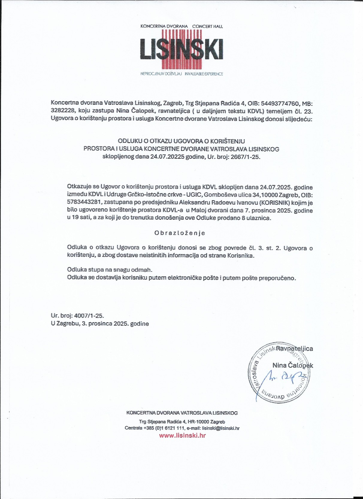 Početna>Nove obavijesti>Otkazan Božićni koncert Hrvatske pravoslavne crkve u KD Vatroslava Lisinskog: HPC najavila pravne korake nakon jednostranog raskida ugovora