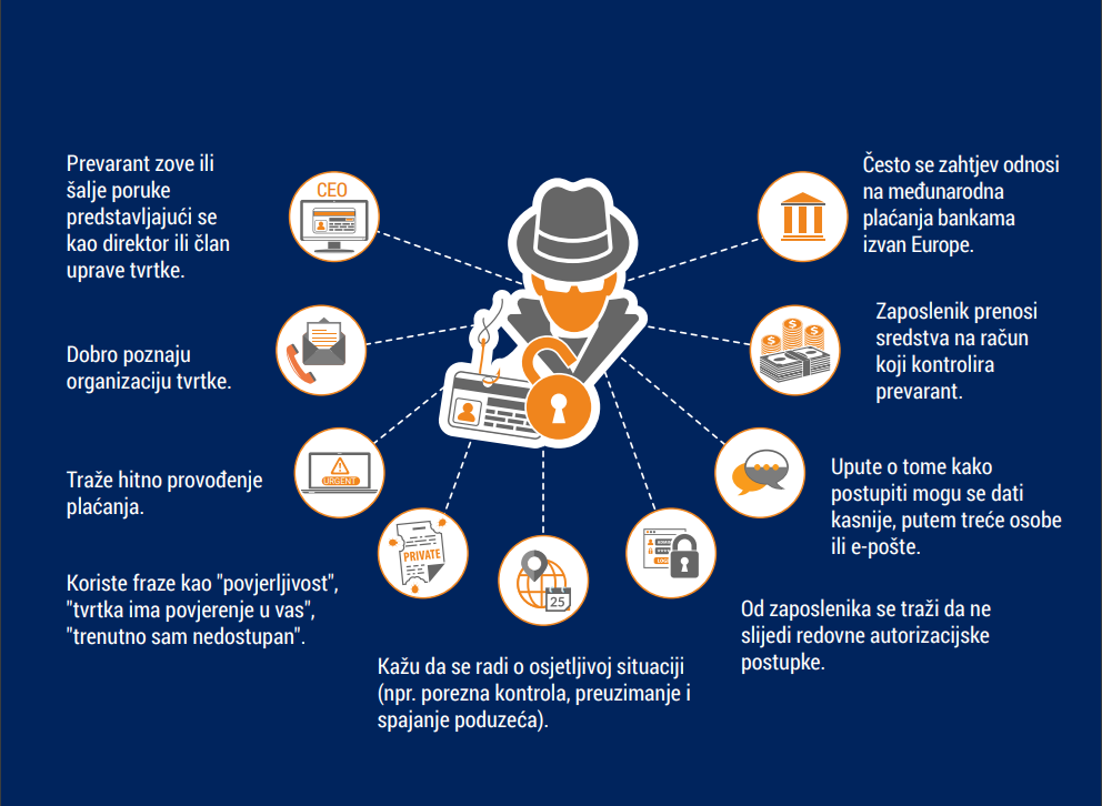 Ova vrsta poslovne prijevare, poznata kao BEC (Business Email Compromise), uključuje napade na poslovnu e-mail korespondenciju. Počinitelji se u ključnom trenutku uključuju u komunikaciju, preuzimajući sugovornikovu stranu, blokirajući e-mailove i šaljući svoje poruke u kojima se predstavljaju kao prodavači, dobavljači ili klijenti. Na taj način navode djelatnike tvrtki da uplate novac na bankovni račun počinitelja.