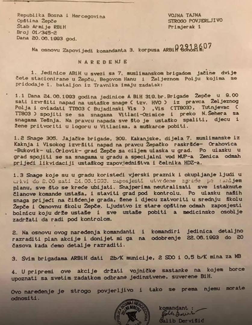 Povijest Domovinskog rata i ratnog sukoba u Bosni i Hercegovini još uvijek krije mnoge potresne, često zataškavane istine. Jedan takav dokument, nastao 20. lipnja 1993. godine pod oznakom stroge tajnosti, nedvosmisleno ukazuje na planiranje ratnog zločina prema hrvatskom stanovništvu u općini Žepče. Naređenje nosi broj 01/345-2, potpisuje ga tadašnji zapovjednik Galib Dervišić, a izdano je u ime Armije BiH.