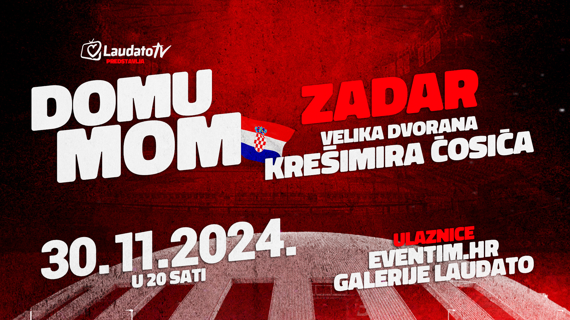 Novi koncert “Domu mom” održat će se 30. studenog 2024. U Zadru u Velikoj dvorani Krešimira Ćosića, u Sportskom centru Višnjik. Ulaznice za ovaj koncert koji se s nestrpljenjem očekuje mogu se nabaviti u online sustavu Eventima, kao i na njihovim prodajnim mjestima te u Laudato galerijama, u Zadru na adresi Ul. don Ive Prodana 11, odmah pokraj Svetišta sv. Šimuna, te u Zagrebu, Gračanska cesta 208.