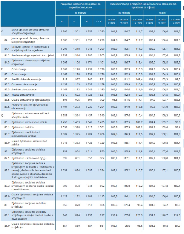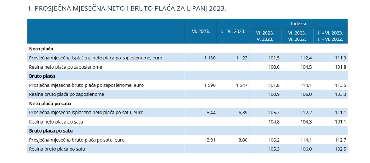 U razdoblju od siječnja do lipnja prosječna mjesečna isplaćena neto plaća iznosila je 1.123 eura, što je u odnosu na isto razdoblje prošle godine nominalno više za 11,9, a realno za 1,8 posto.