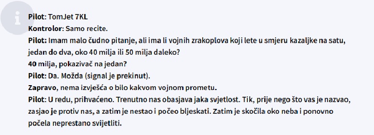 Na audio snimci se može zaključiti kako je pilot upitao kontrolu leta dali ima vojnih zrakoplova koji lete u smjeru kazaljke na satu, jedan do dva, oko 40 milja ili 50 milja daleko? Na što pilotu odgovara kontrolor leta; nema izvješća o bilo kakvom vojnom prometu. na što pilot zrakoplova obavještava kontrolora leta; Trenutno nas obasjava jaka svjetlost. Tik, prije nego što vas je nazvao, zasjao je protiv nas, a zatim je nestao i počeo bljeskati. Zatim je skočila oko neba i ponovno počela neprestano svijetliti.