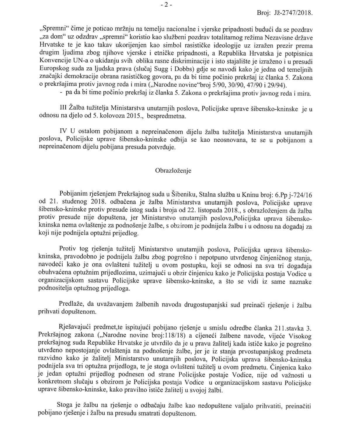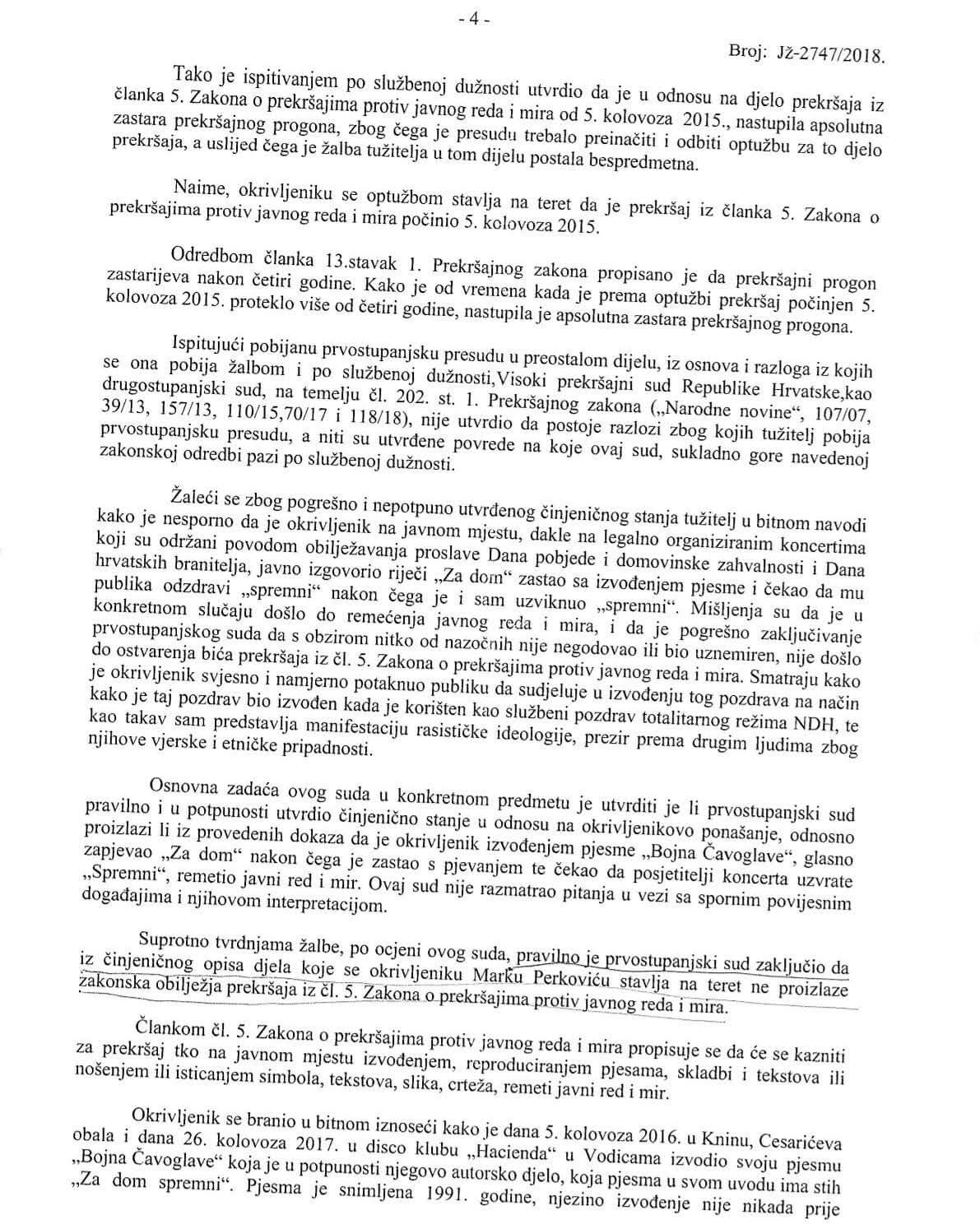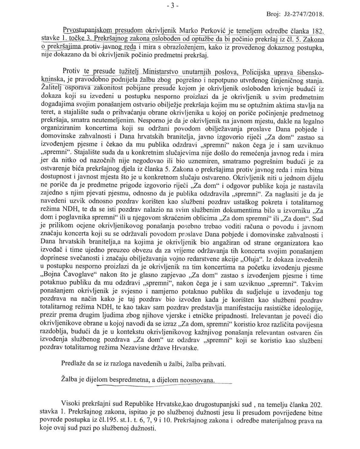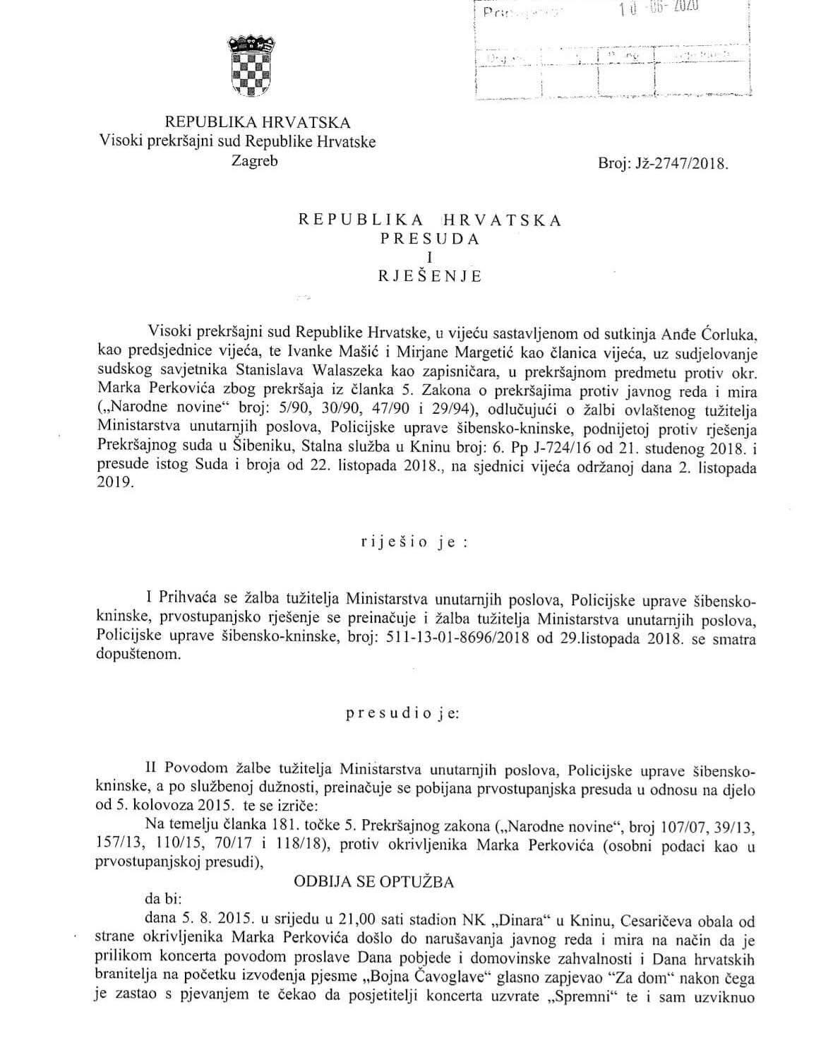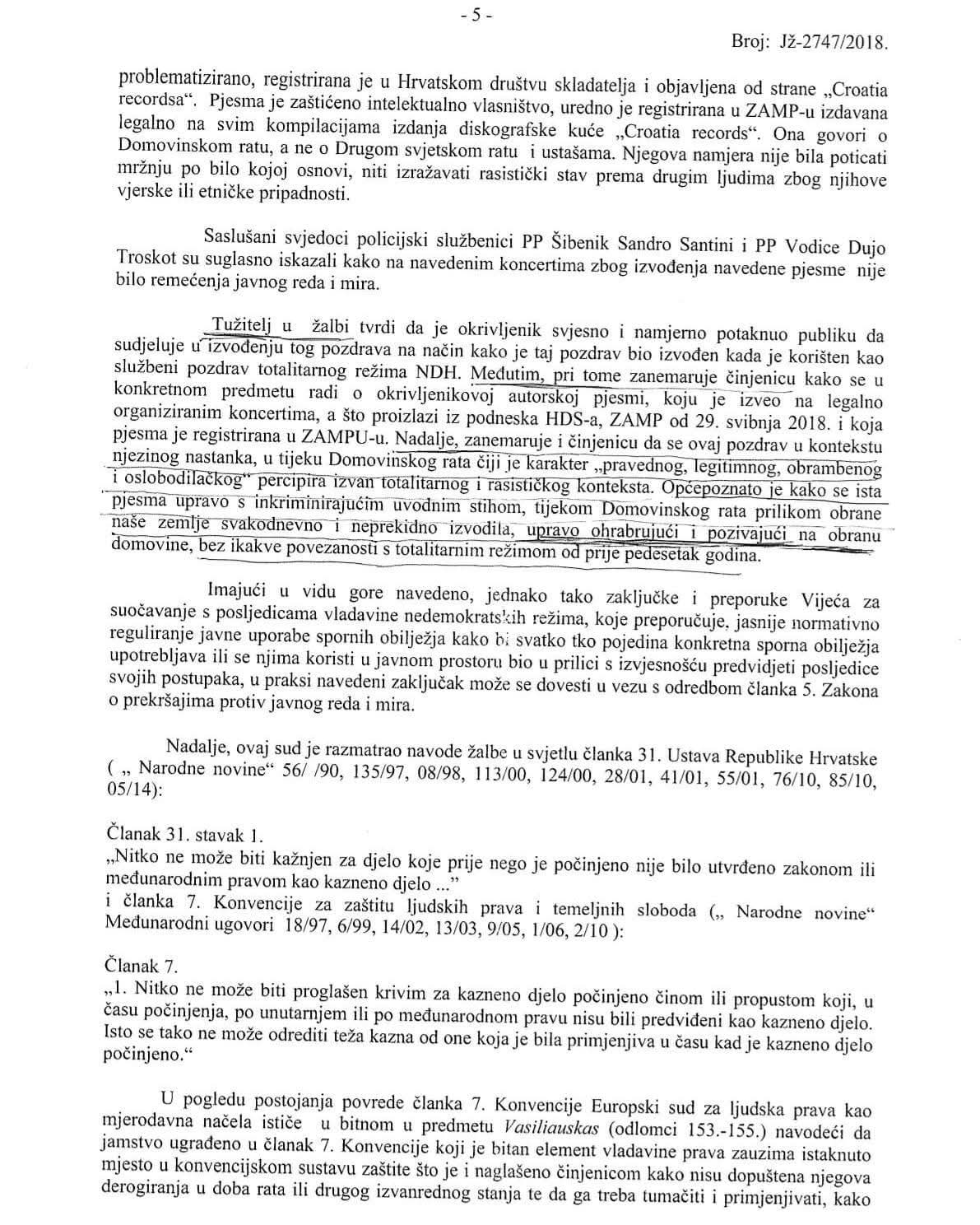 Presudom (broj Jž-2747/2018) Visoki sud potvrdio je raniju odluku Prekršajnog suda u Šibeniku, zaključivši da se u konkretnom slučaju ne može dokazati postojanje zakonskih obilježja prekršaja iz članka 5. Zakona o prekršajima protiv javnog reda i mira, jer je sporni uzvik izrečen u kontekstu izvođenja pjesme koja je nastala tijekom Domovinskog rata i kao takva je registrirana i zaštićena autorska tvorevina.