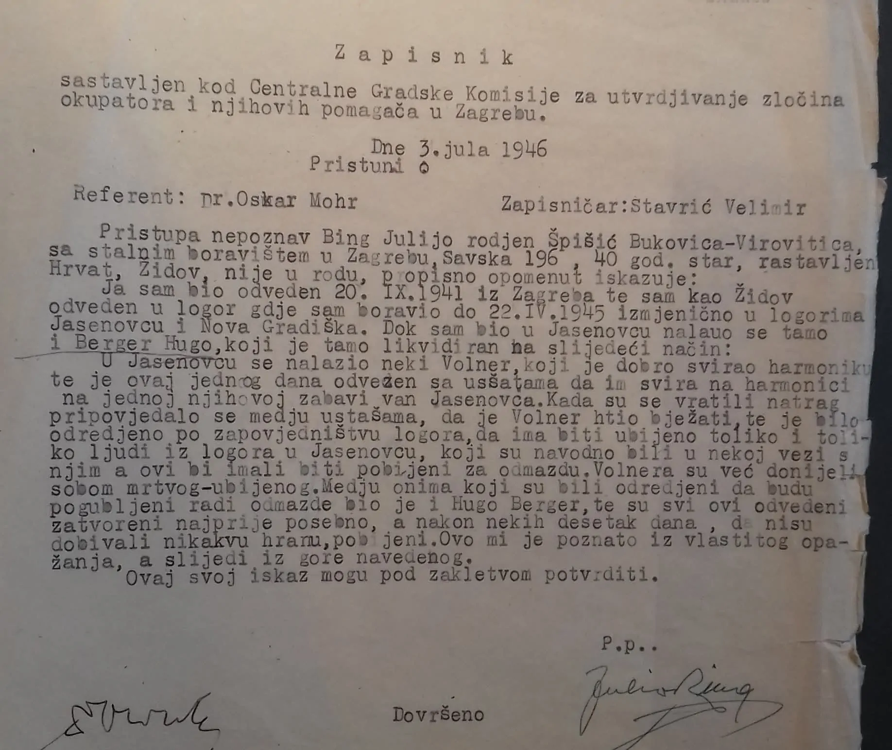 Jedan takav dokument, nastao 3. srpnja 1946. u Zagrebu, sadrži iskaz Julija Binga, Židova rođenog u Špišić Bukovici, tada četrdesetogodišnjeg stanovnika Zagreba. Dokument otkriva kako su izgledala ta svjedočenja i na koji se način stvarala slika o događajima u logoru Jasenovac.