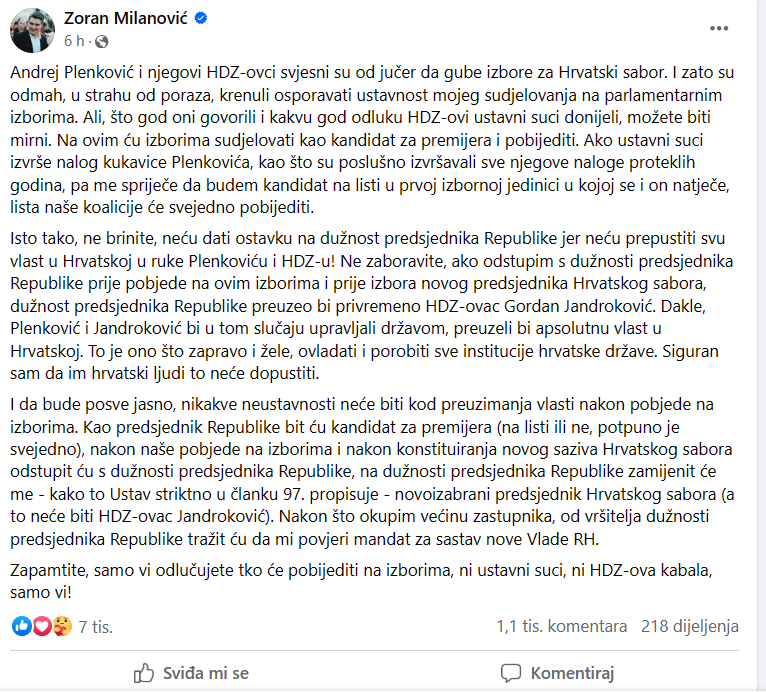 Andrej Plenković i njegovi HDZ-ovci svjesni su od jučer da gube izbore za Hrvatski sabor. I zato su odmah, u strahu od poraza, krenuli osporavati ustavnost mojeg sudjelovanja na parlamentarnim izborima. Ali, što god oni govorili i kakvu god odluku HDZ-ovi ustavni suci donijeli, možete biti mirni. Na ovim ću izborima sudjelovati kao kandidat za premijera i pobijediti. Ako ustavni suci izvrše nalog kukavice Plenkovića, kao što su poslušno izvršavali sve njegove naloge proteklih godina, pa me spriječe da budem kandidat na listi u prvoj izbornoj jedinici u kojoj se i on natječe, lista naše koalicije će svejedno pobijediti.